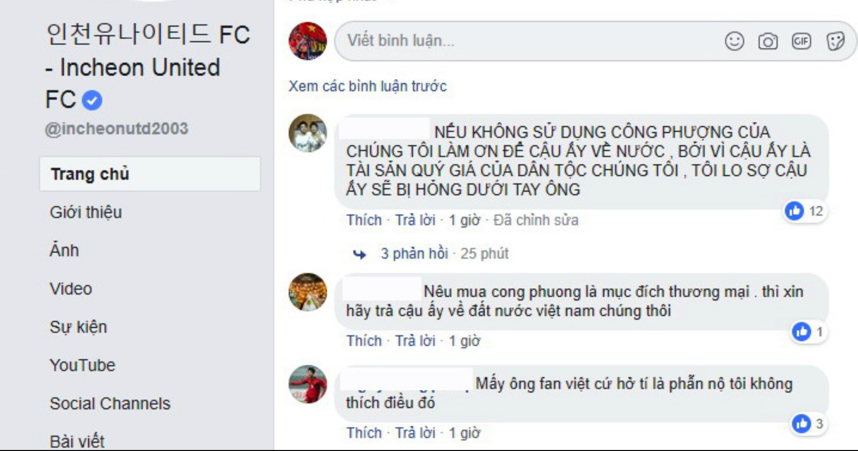 Phản ứng của một số người mến mộ Việt Nam trên fanpage Incheon United sau trận khai mạc K.League Classic 2019.