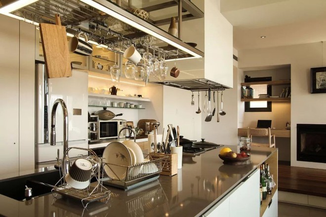 Trong số đó, bàn nấu là cốt lỗi, nằm ở trung tâm. Bên phải là bồn rửa và xung quanh là những nơi lưu trữ nguyên vật liệu cũng như vật dụng phục vụ cho việc nấu nướng hằng ngày. Tại bồn rửa chén, cô Diệp thiết kế nơi đựng đồ tiện dụng, thí dụ như những chiếc xẻng, chiếc muỗng đều treo phía trên của bếp, cô sẽ để mọi thứ trong tầm tay, trong tầm mắt, chỉ cần với tới là có được mọi thứ.
