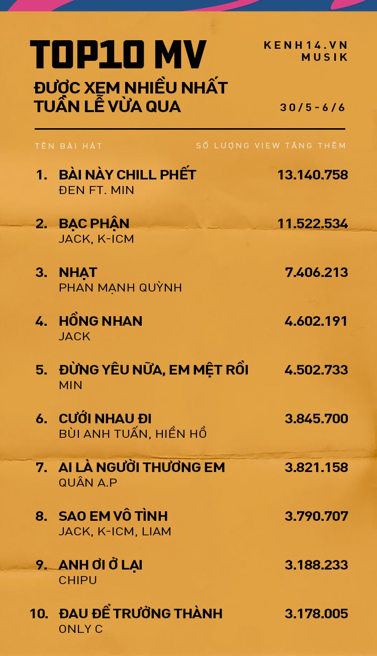 - 10 MV Vpop được xem nhiều nhất tuần qua: Đen và Min bứt phá dẫn đầu, Jack chiếm đến 4 vị trí trong top!