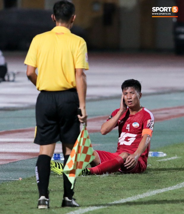 Thế nhưng, các trọng tài không cho rằng anh bị đánh nguội. Trung vệ 24 tuổi đành ôm mặt về lại vị trí.