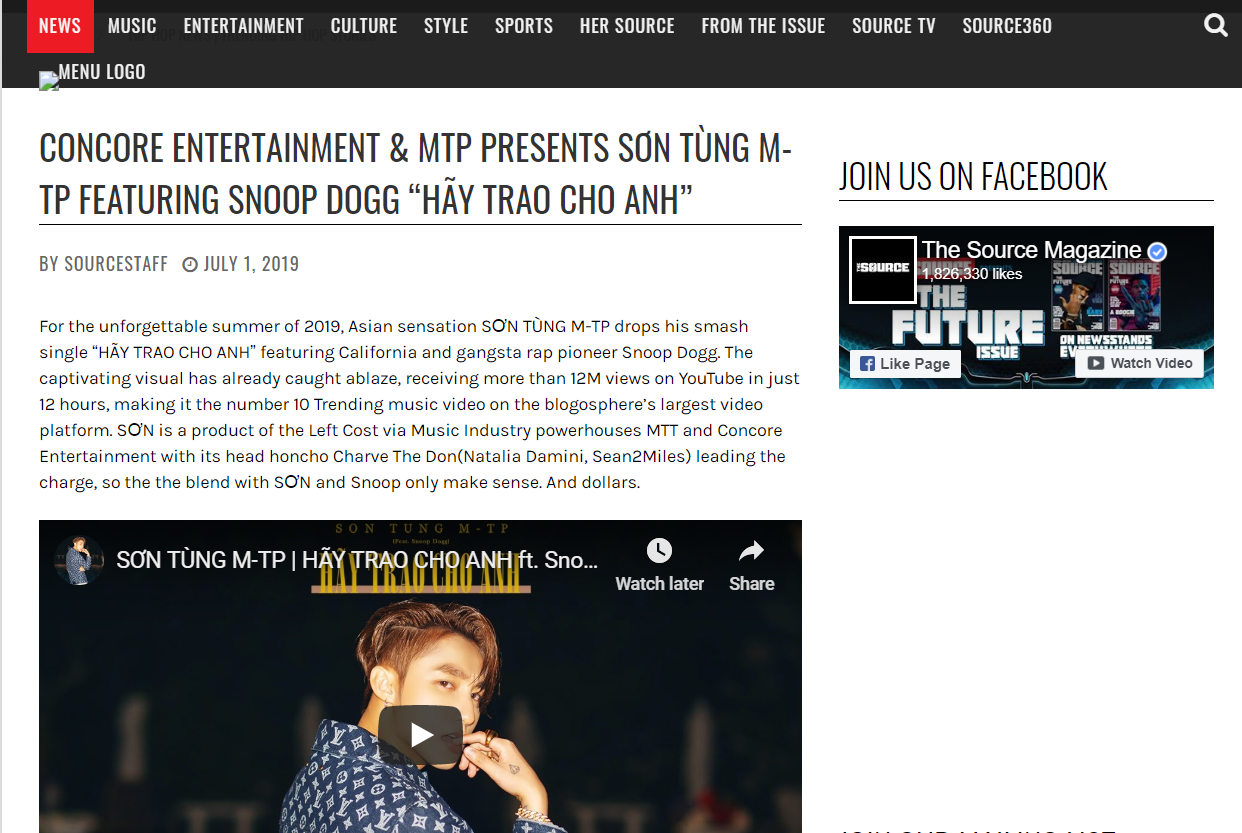 Tạp chí The Source được thành lập vào năm 1988, chuyên đưa tin về Hip Hop và giải trí ở Mỹ. Đây cũng là tạp chí định kì chuyên về rap có tuổi đời lâu nhất thế giới. Thông tin về Sơn Tùng M-TP và "Hãy Trao Cho Anh" xuất hiện trên tạp chí này khiến người hâm mộ không khỏi tự hào, điều này thể hiện danh tiếng của nam ca sĩ đã vươn ra ngoài thị trường nội địa.