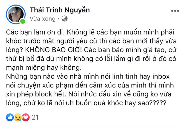 Sau sự việc này, Thái Trinh liên tục nhận về nhiều chỉ trích. Nhiều người thậm chí còn inbox chửi nữ ca sĩ quá giả tạo. Bức xúc, Thái Trinh lên tiếng trên trang cá nhân: " Các bạn làm ơn đi. Không lẽ các bạn muốn mình phải khóc trước mặt người yêu cũ thì các bạn mới thấy vừa lòng? Không bao giờ, các bạn bảo mình giả tạo, cứ thử bị bồ đá dù mình không có lỗi lầm gì đi rồi ở đó có mạnh miệng hay không. Những bạn nào vào nhà mình nói linh tinh hay inbox nói chuyện xúc phạm đến cảm xúc của mình thì mình xin phép block hết. Nói nhức đầu xin về cũng không vừa lòng, chứ ko lẽ nói uh buồn quá khóc hay sao?" .