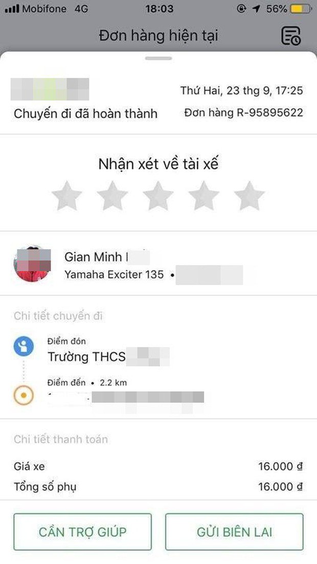 Theo đơn trình báo, vào khoảng 17h ngày 23/9, sau khi tan học tại một trường THCS ở quận 3 thì em K. mở ứng dụng đặt xe qua app để đặt xe về nhà. Qua ứng dụng, tài xế nhận cuốc đến đón K. là G.M. H. đi xe máy có biển số: 59S1 – 856xx.