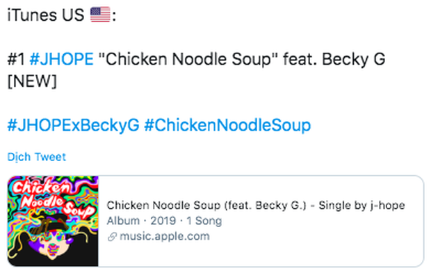Và kết quả ban đầu mà "Chicken Noodle Soup" nhận được vô cùng ấn tượng, thậm chí vượt xa hơn kỳ vọng. Ca khúc giúp J-Hope trở thành idol solo đầu tiên của một nhóm nhạc Kpop đạt vị trí no.1 trên US iTunes Song Chart. Trên mặt trận solo, J-Hope là nghệ sĩ thứ 2 sau PSY đạt được thành tích này. Sau 6 năm kể từ "Gangnam Style" mới có một bài hát Kpop đạt được thành tích no.1 tại US iTunes Song Chart.
