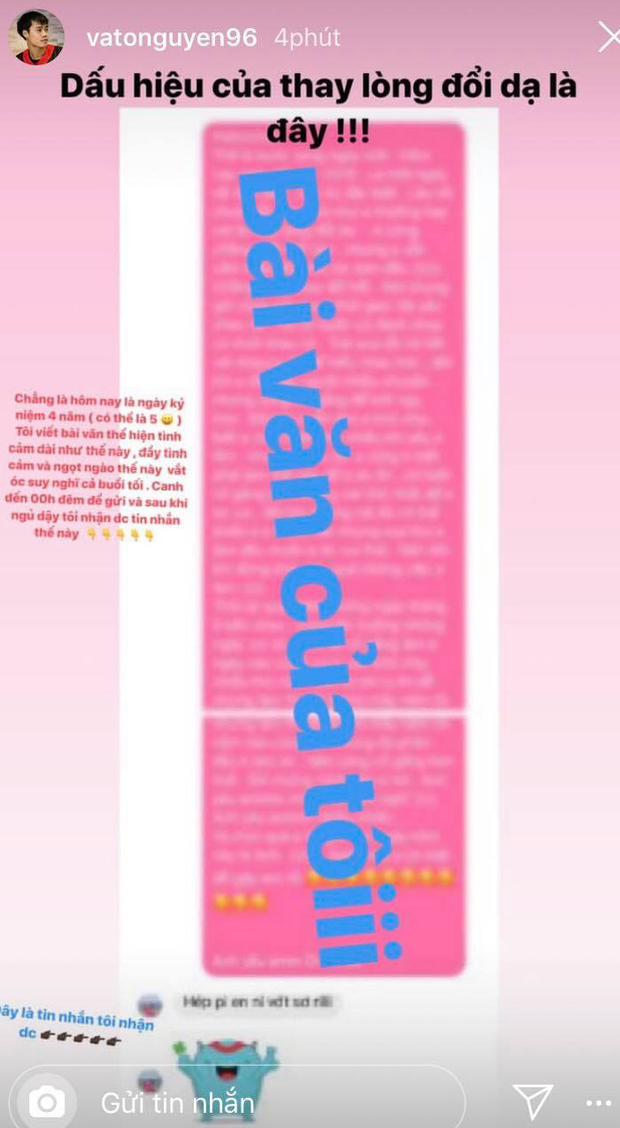 "Dấu hiệu của thay lòng đổi dạ là đây. Chẳng là hôm nay là ngày kỉ niệm 4 năm (có thể là 5 năm). Tôi viết bài văn thể hiện tình cảm dài như thế này, đầy tình cảm và Công ty dịch thuật Đồng Nai ngọt ngào thế này, vắt óc suy nghĩ của buổi tối. Canh đúng 0h đêm để gửi và sau khi ngủ dậy tôi nhận được tin nhắn thế này", Văn Toàn càm ràm bạn gái.